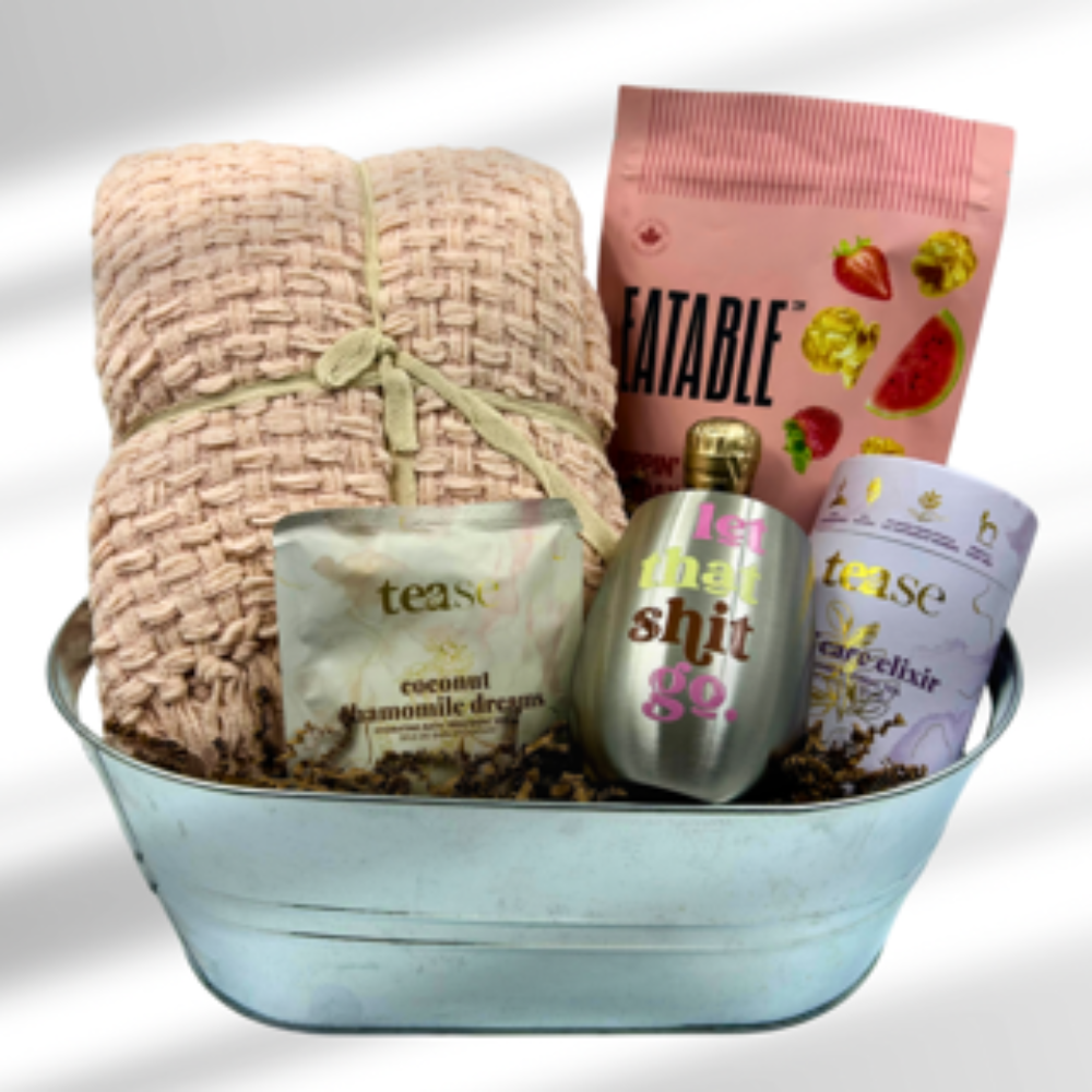 When life gets overwhelming, sometimes you just need to let go and unwind—and this gift basket has everything to help you do just that. Cozy up with a luxuriously soft handmade blanket from India while enjoying wine-infused popcorn and a refreshing sip of bubbly in a stainless steel stemless glass, cheekily etched with “Let That S*%t Go.” Indulge in a relaxing bath soak to melt away stress, and finish the moment of zen with a cup of premium tea. Thoughtfully curated to inspire tranquility and self-care, this basket is the perfect reminder to embrace peace and let go of what no longer serves you.