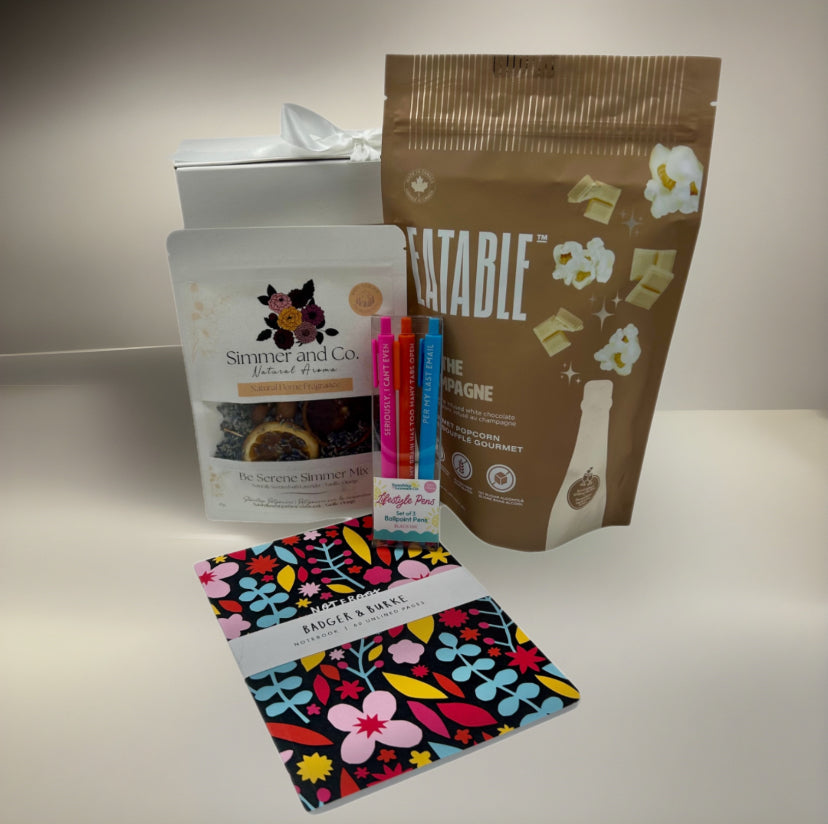 Find your balance and embrace a little self-care with the Mindful Moments gift box, thoughtfully curated for anyone needing a moment to pause and recharge. Savour the indulgence of champagne-infused popcorn while enjoying the soothing aromas of an all-natural simmer pot kit. Let creativity flow with a vibrant, unlined notebook featuring 60 blank pages—perfect for journaling, doodling, or brainstorming. And for a touch of humour, the accompanying set of three pens will keep you smiling with their cheeky inscriptions: "Seriously, I can't even," "As per my last email," and "My brain has too many tabs open." This gift box makes slowing down feel like a celebration.
