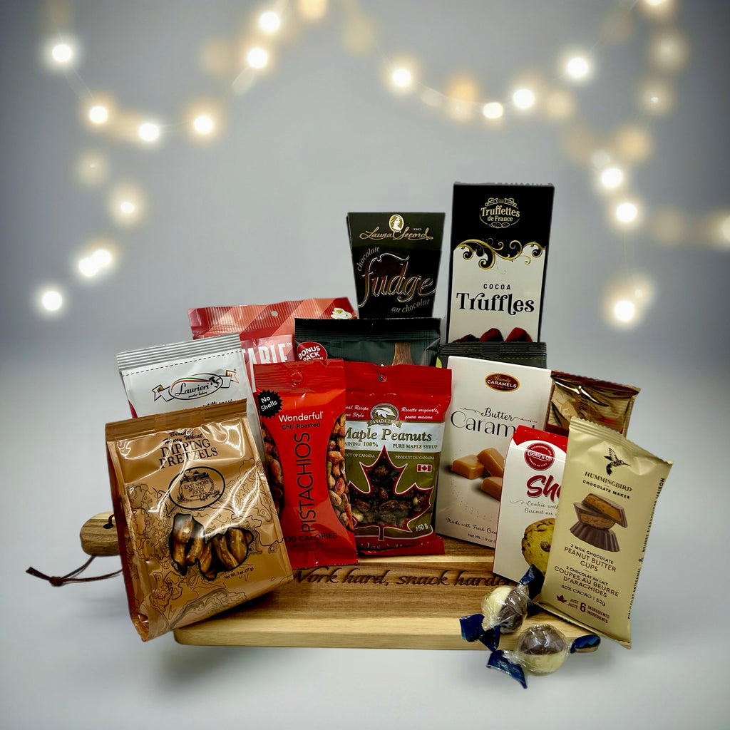 Our stunning Acacia wood cutting board, engraved with 'Work Hard, Snack Harder' makes a thoughtful gift for any office!