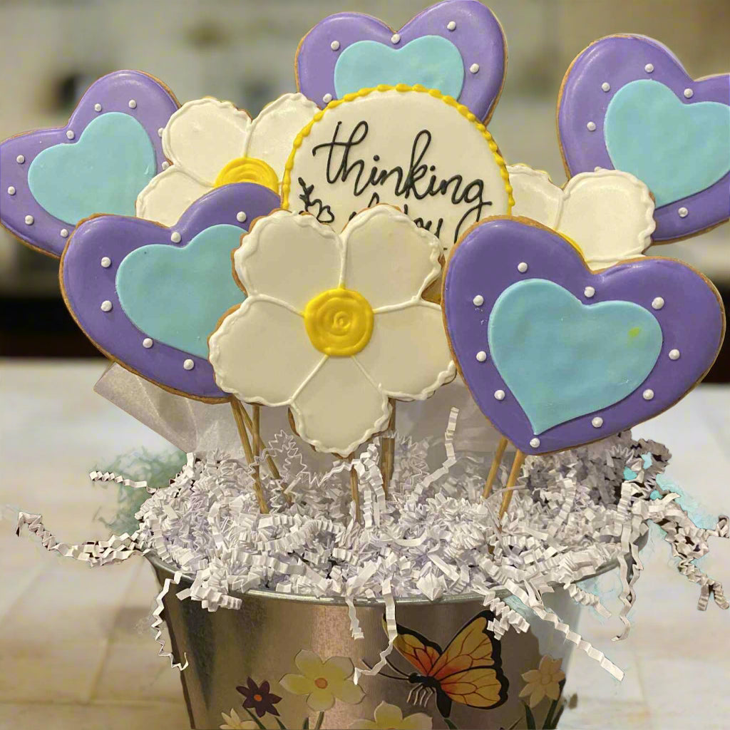Our Decorated Sugar Cookie Basket is filled with beautifully hand-decorated sugar cookies, made to impress and delight. Perfect for birthdays, thank-yous, celebrations, or “just because,” these cookies are as delicious as they are beautiful. Includes container, wrap and hand tied bow.